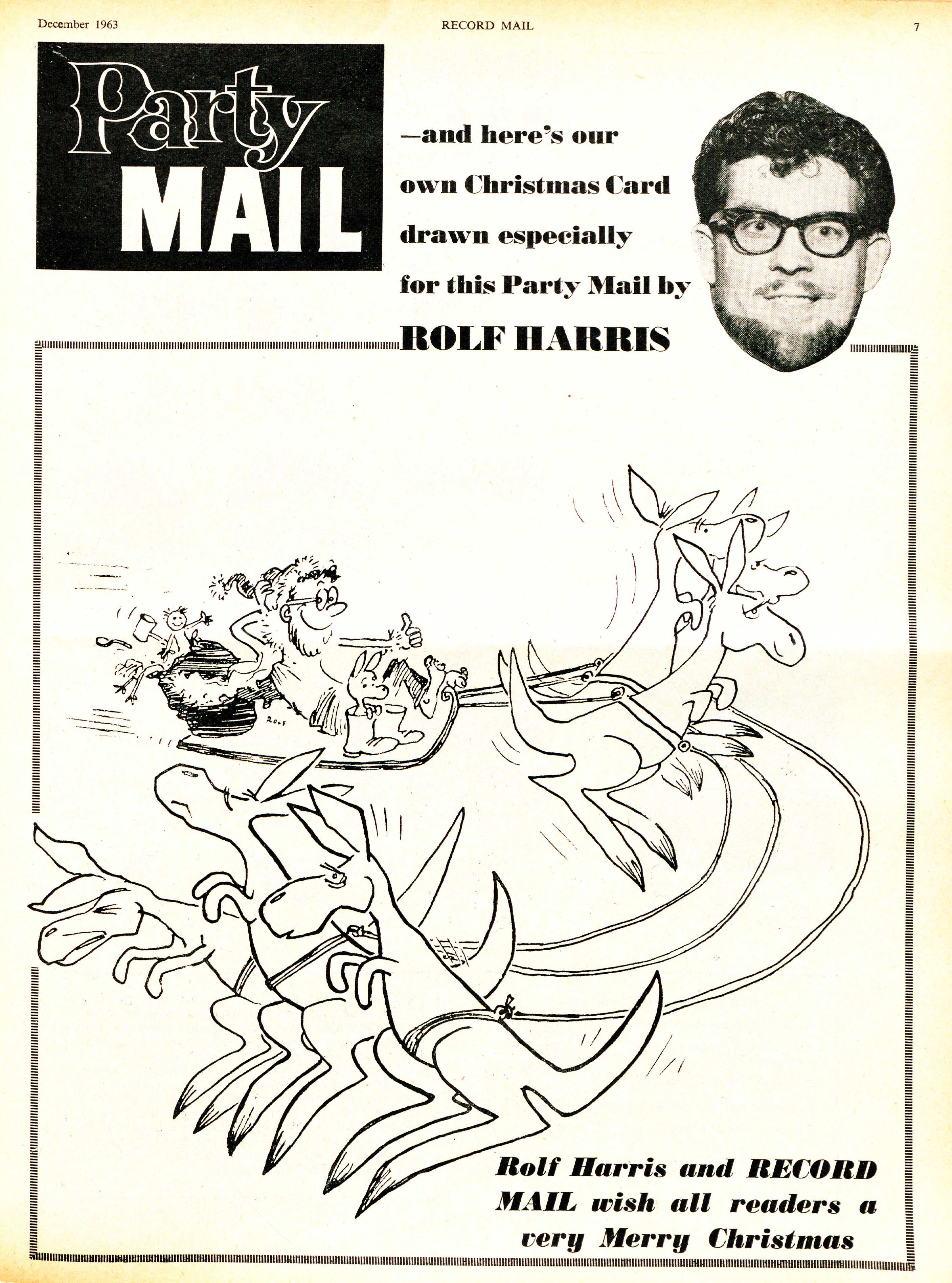 Rolf Harris cartoon Christmas card published in Party MAIL (ie RECORD MAIL, Christmas issue), December 1963, page 1.
