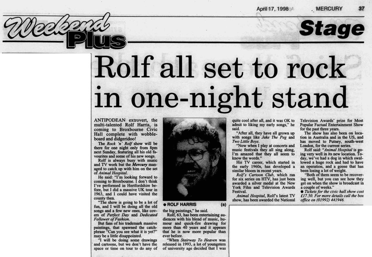 Rolf all set to rock in one-night stand published in the Cheshunt and Waltham mercury, April 17, 1998, page 37.